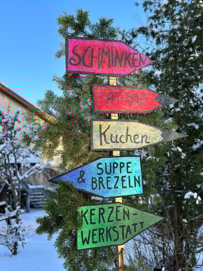 Ein Höhepunkt des Winterfestes war zweifelsfrei der Besuch des Weihnachtsmanns und seiner Engel, die die Gäste am Eingang des Schullandheims begrüßten. Für viele Kinder war es die perfekte Gelegenheit, noch einen Last-Minute-Wunsch für Heiligabend zu äußern. Zusammen mit dem Weihnachtsmann zogen die Kleinsten bei einsetzender Dunkelheit dann mit ihren selbst gebastelten Laternen zum großen Laternenumzug.